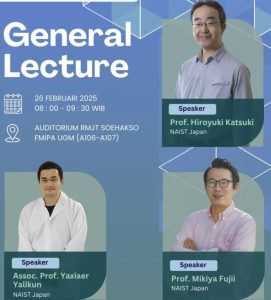 Pada tanggal 26 Februari 2025, Departemen Fisika Fakultas Matematika dan Ilmu Pengetahuan Alam Universitas Gadjah Mada menyelenggarakan kegiatan General Lecture yang menghadirkan tiga narasumber terkemuka dari NAIST Japan. Acara ini berlangsung di Auditorium RMJT Soehakso FMIPA UGM pada pukul 08.00 hingga 09.30 WIB.